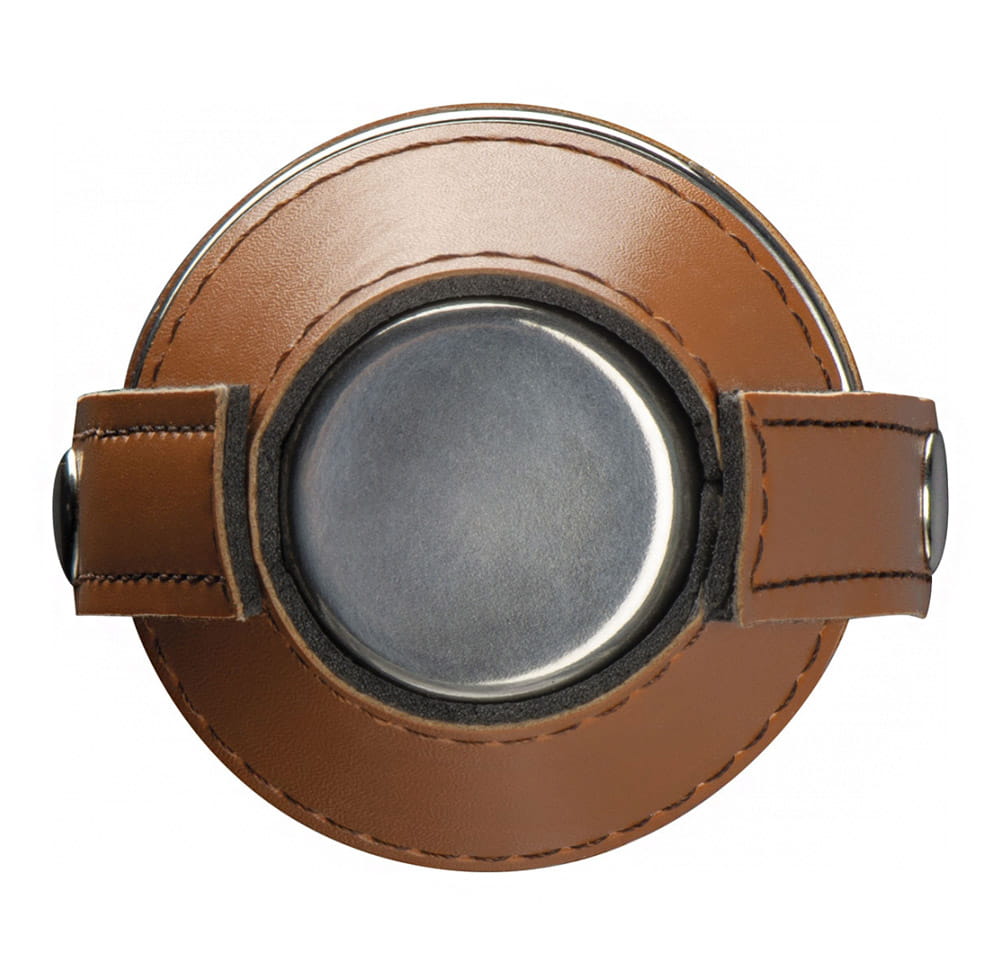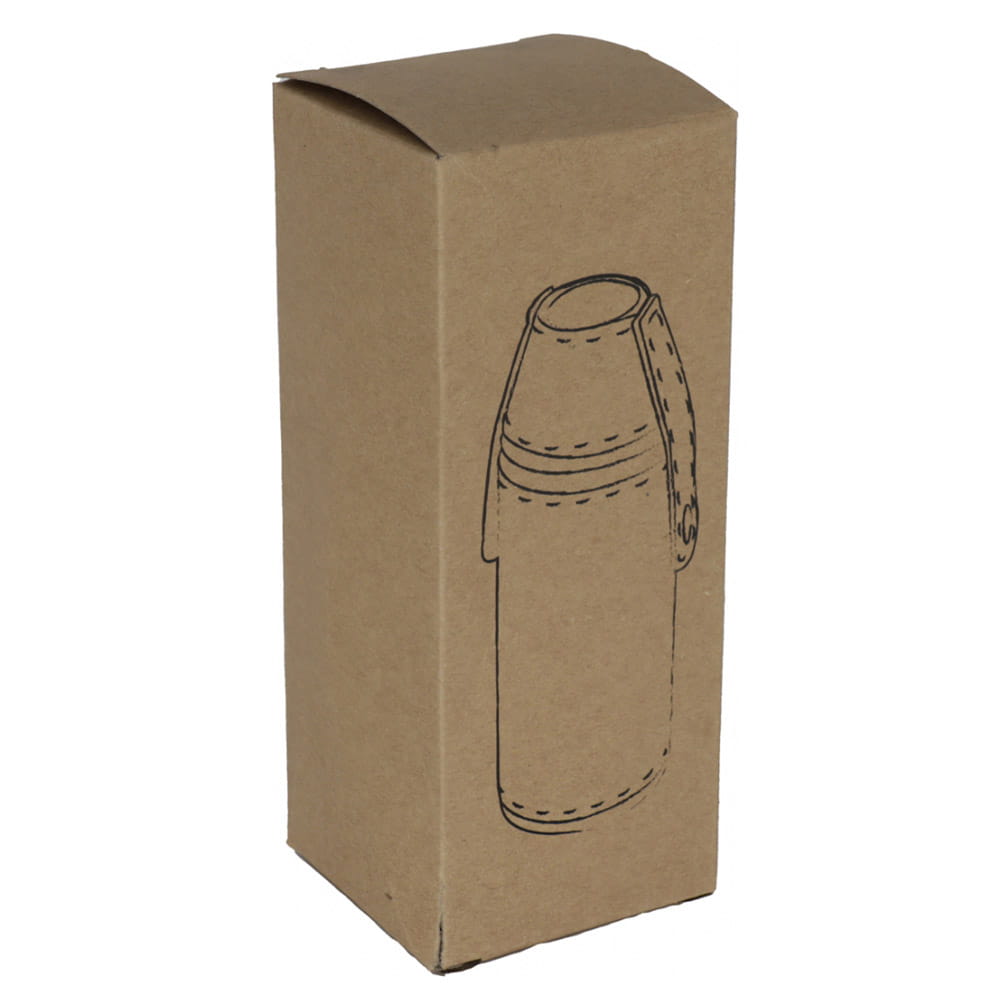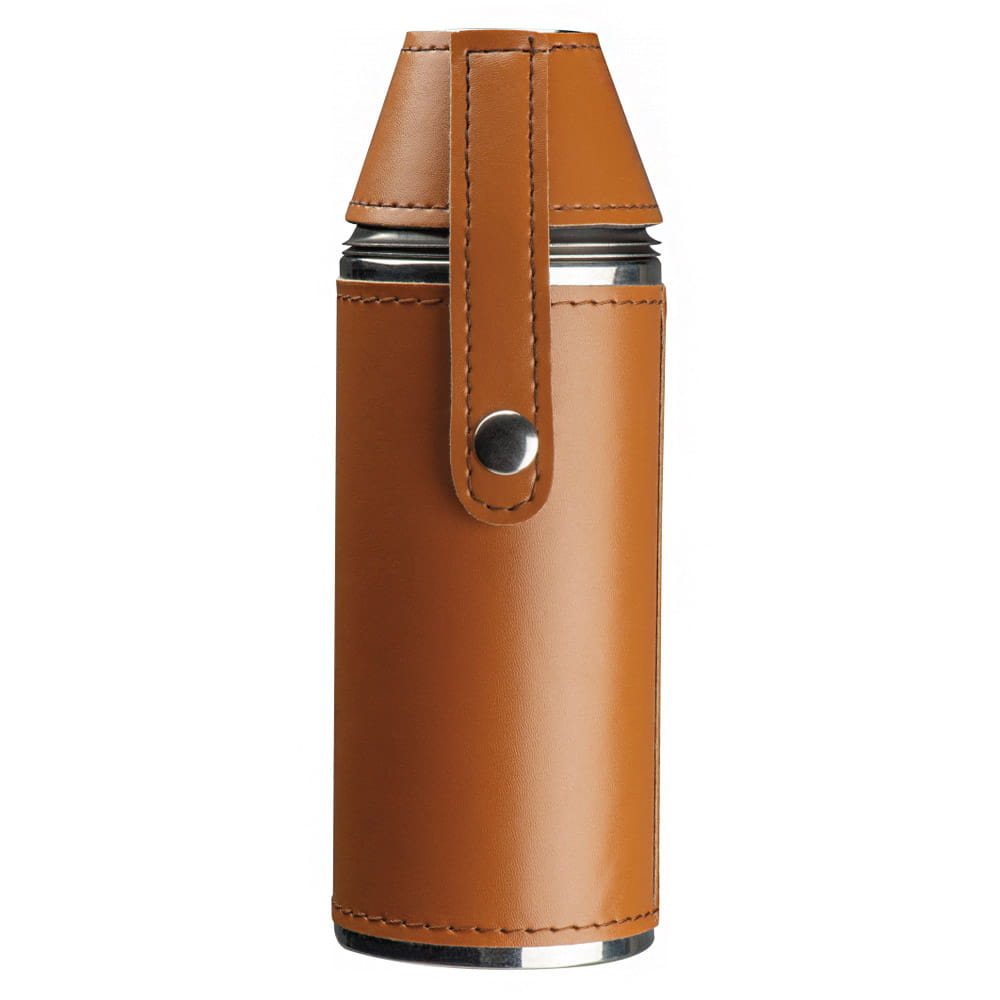 Okrągła piersiówka wykonana ze stali nierdzewnej obita skóropodobnym materiałem PU, z dwoma kieliszkami. Piersiówka ma pojemność 230 ml, kieliszki: każdy po 40 ml.
