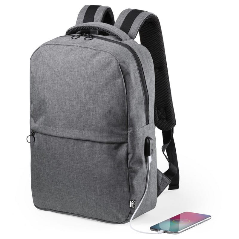 Plecak z miękką przegrodą na laptopa 15" i tablet 10", wykonany z rPET, gniazdo USB do ładowania telefonów (power-bank nie dołączony), miękki tył i paski na ramię
