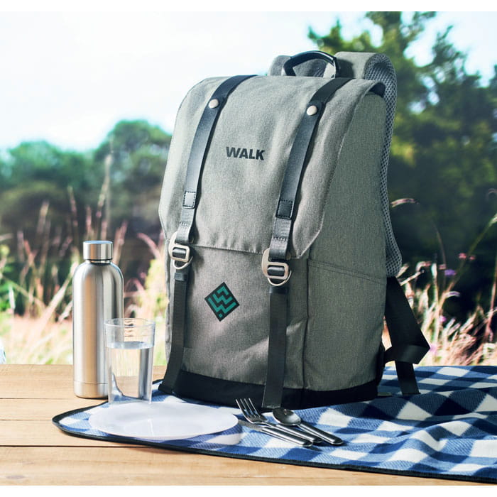 Plecak piknikowy dla 4 osób z chłodzącą przegrodą bazową, z wysokiej jakości sztućcami i 1 korkociągiem w stylu kelnerskim. Torba z poliestru barwionego kationowo.
