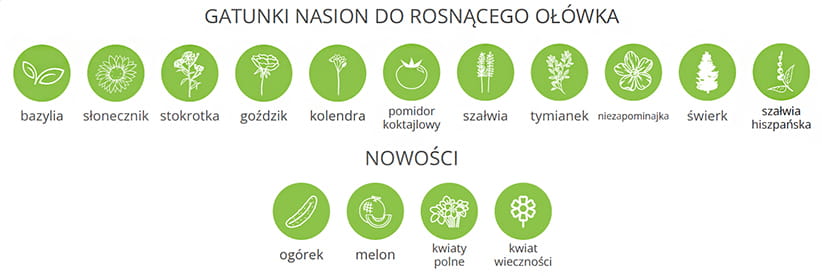 bazylia, słonecznik, stokrotka, goździk, kolendra, pomidor koktajlowy, szałwia, tymianek, niezapominajka, świerk, szałwia hiszpańska i nowości: ogórek, melon, kwiaty polne, kwiat wieczności