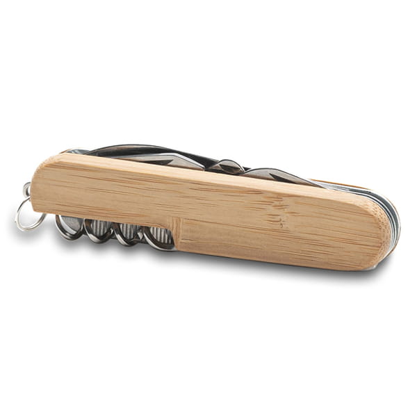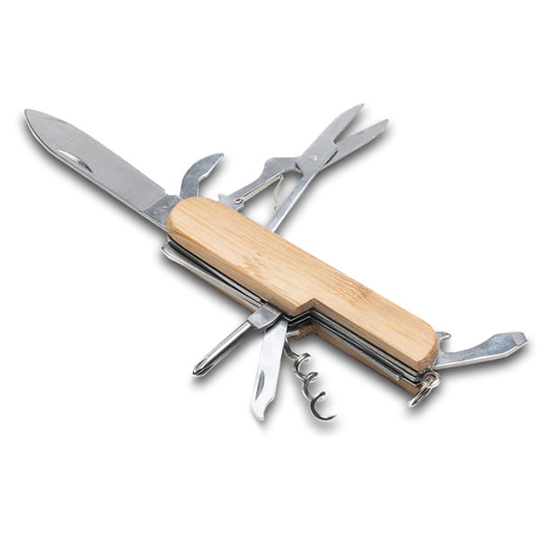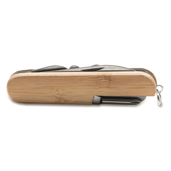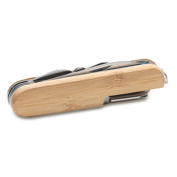 Scyzoryk wykonany ze stali nierdzewnej oraz bambusa. Posiada 12 funkcji. Na bambusowej powierzchni mogą występować różnice w kolorze i strukturze drewna. Zawiera: 1) skrobak do ryb, końcówka do haczyków wędkarskich, 2) nożyczki, 3) piła, 4) otwieracz do konserw, 5) nóż, 6) ucho do przewlekania, 7) pilnik, 8) szydło, 9) wkrętak krzyżowy, 10) korkociąg, 11) kółko do troczenia, 12) otwieracz do butelek, 13) wkrętak płaski.