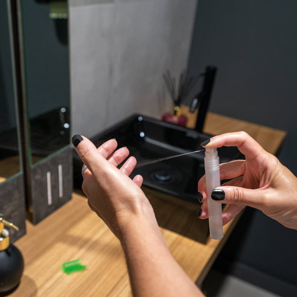 Spray do mycia rąk na bazie alkoholu z zatyczką i pojemnością do 10 ml. do ponownego napełnienia. Formuła z 68% alkoholem.