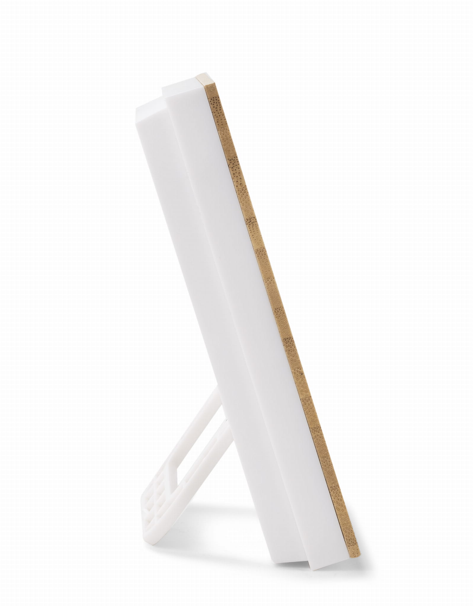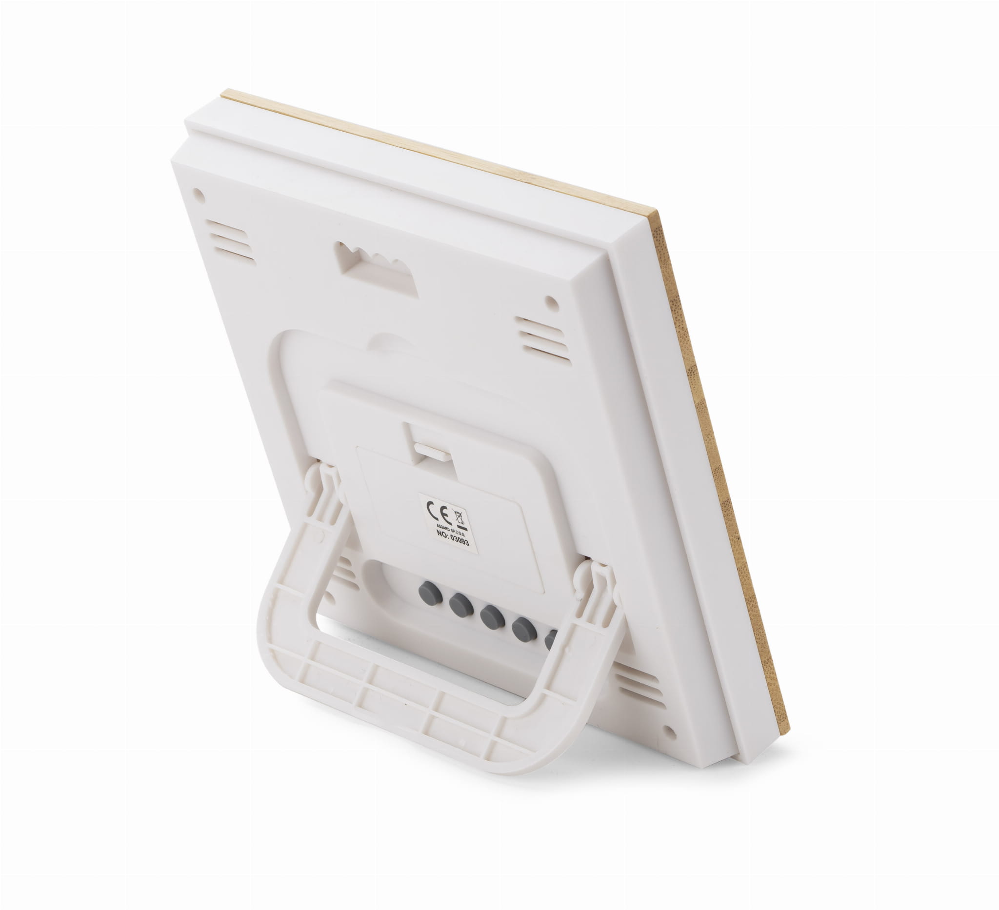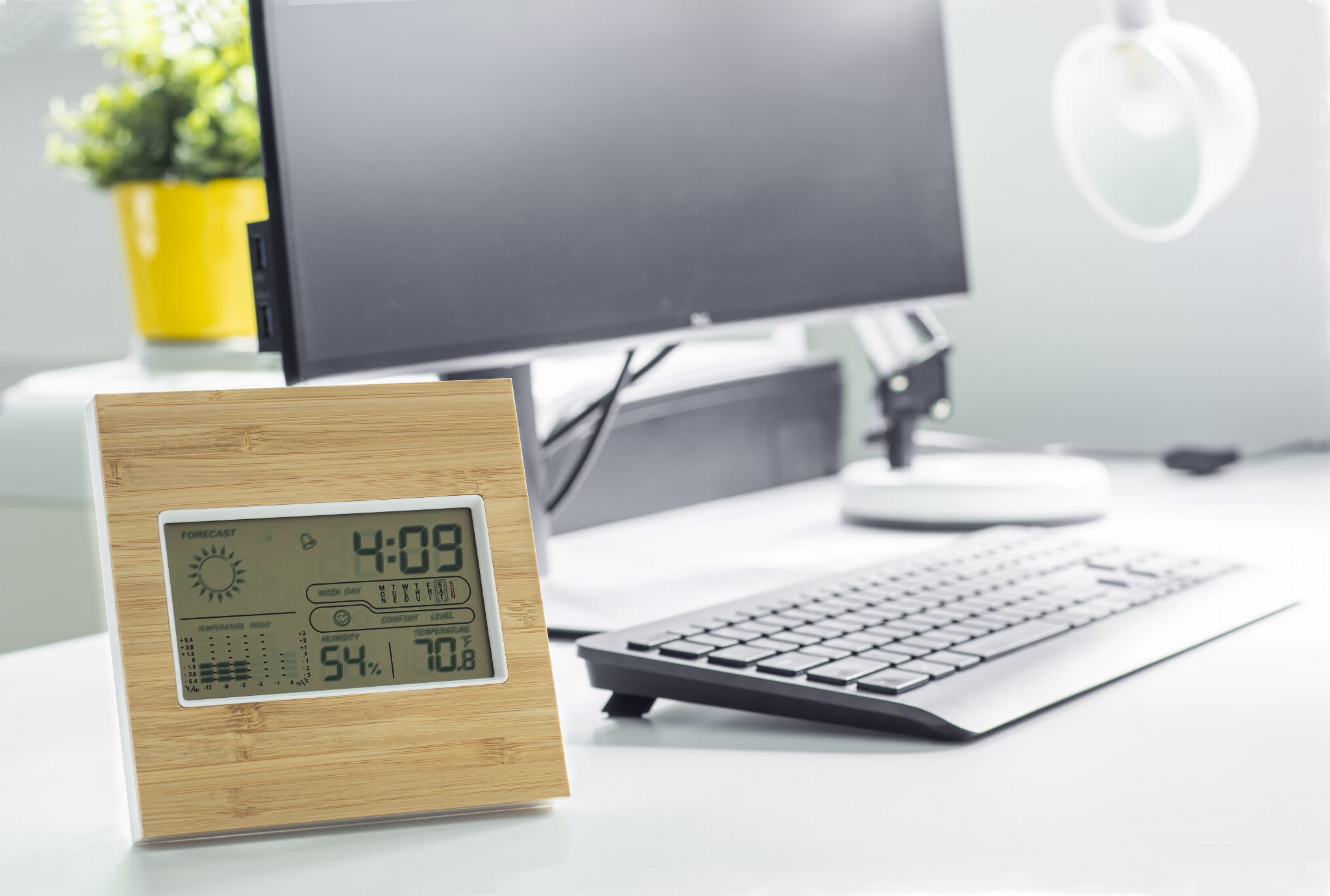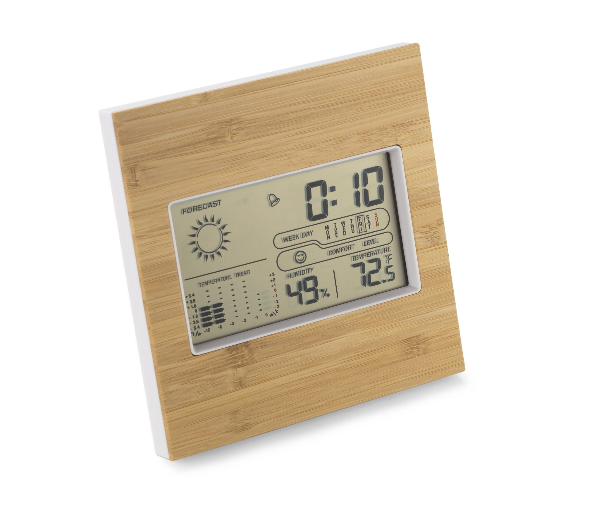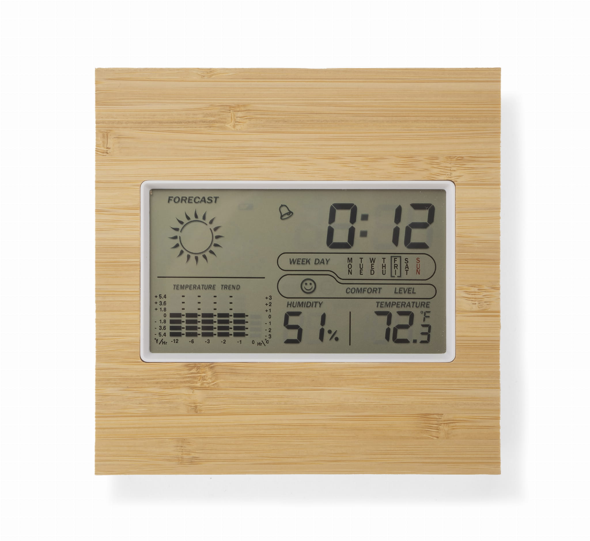 Stacja pogody z możliwością pomiaru temperatury wewnątrz pomieszczenia. Posiada następujące funkcje: godzina, data, dzień tygodnia, temperatura wewnętrzna, wilgotność powietrza, poziom komfortu, wizualizacja pogody oraz budzik. Przód obudowy pokryty jest warstwą bambusową, co doskonale współgra z minimalistyczną stylistyką wnętrz.