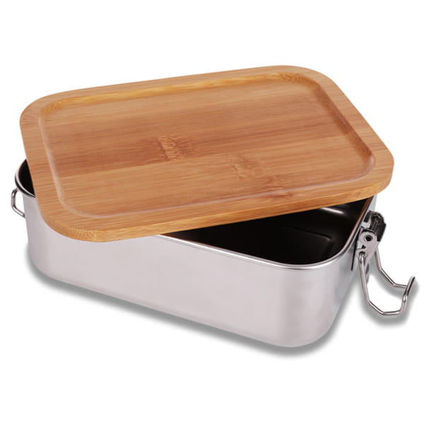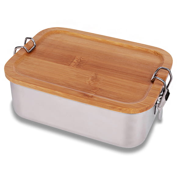 Lunch box ze stali nierdzewnej z bocznymi klamrami i bambusową pokrywką. Pojemność 800 ml.