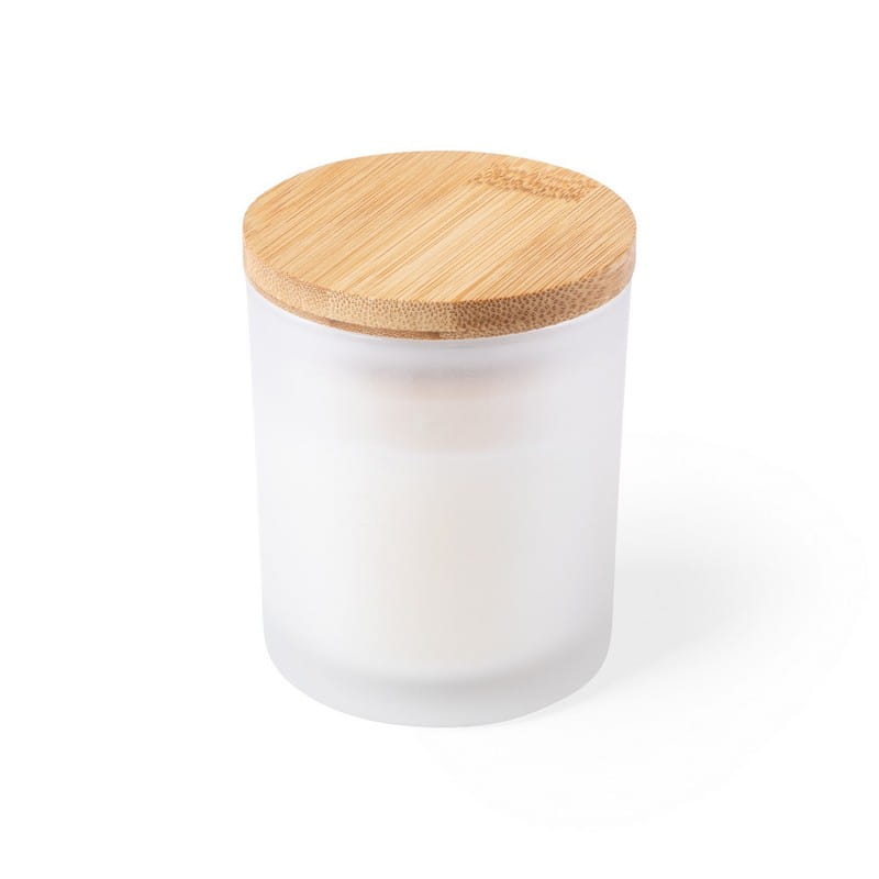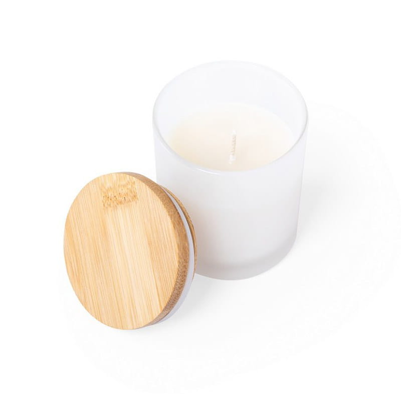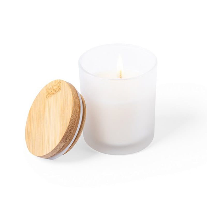 Świeczka o zapachu waniliowym, w szklanym świeczniku z bambusowym wieczkiem.