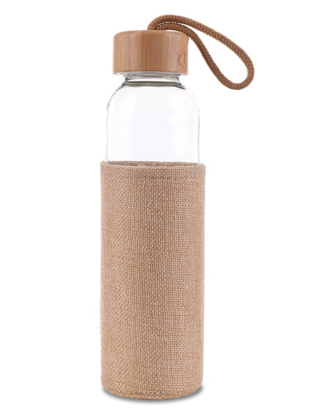 Szklana butelka w lnianym etui, zamykana szczelną, bambusową nakrętką z uchwytem. Ekologiczna alternatywa dla plastikowych butelek.