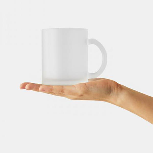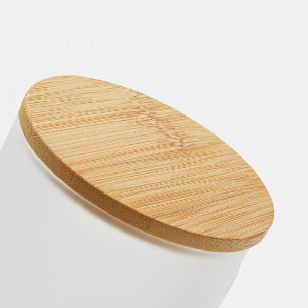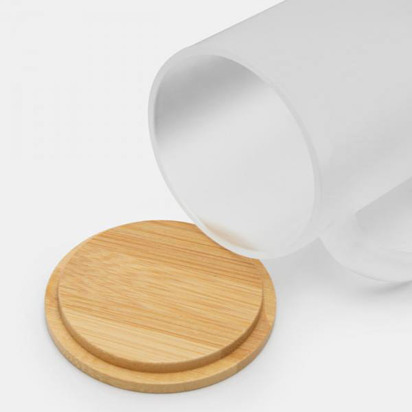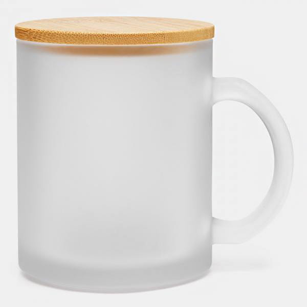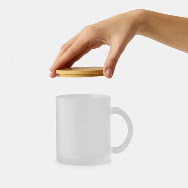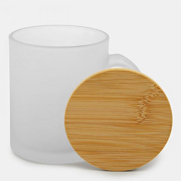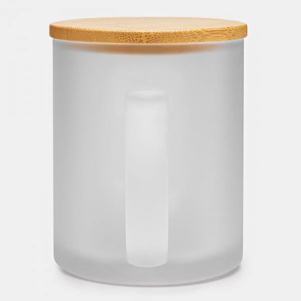 Szklanka z uchem, szkło matowe, pokrywka bambusowa, szkło matowe, pojemność ok. 330 ml.