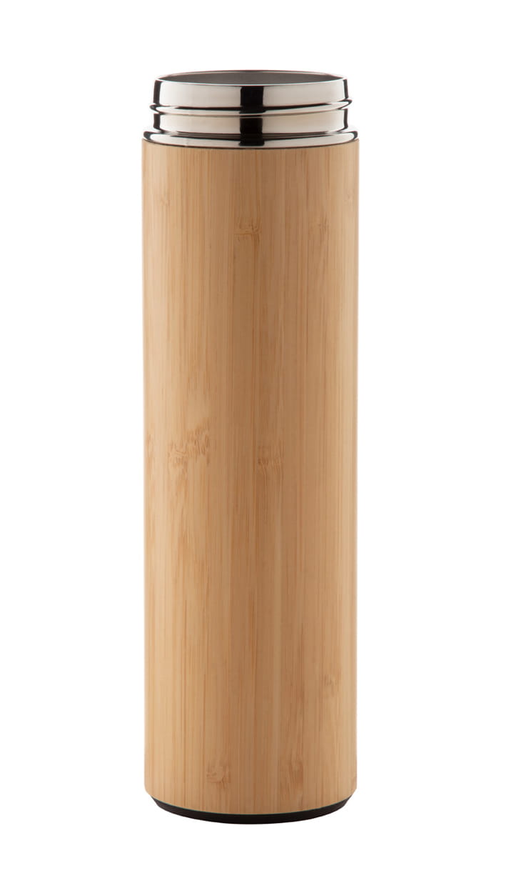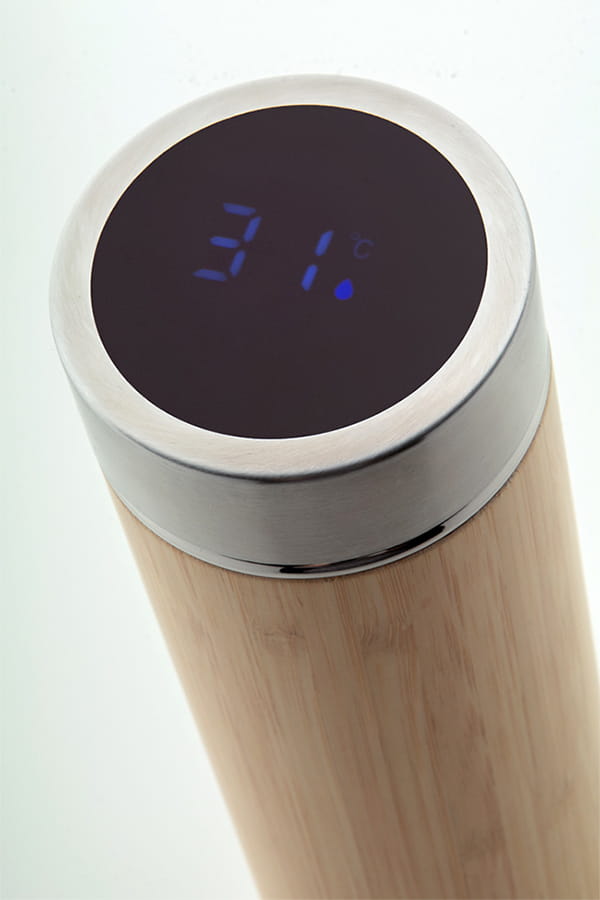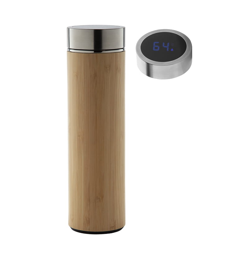 Termos ze stali nierdzewnej i bambusa z izolacyjną podwójną ścianką z zaparzaczem do herbaty i dotykowym termometrem LED na pokrywce. Pojemność: 500 ml. W zestawie z baterią guzikową.