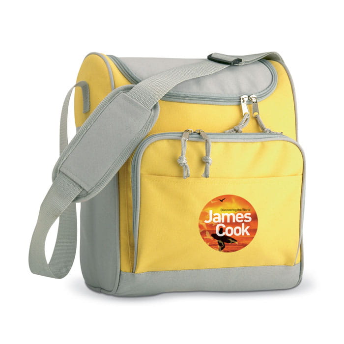 Torba izotermiczna z przednią kieszenią i dwoma suwakami.