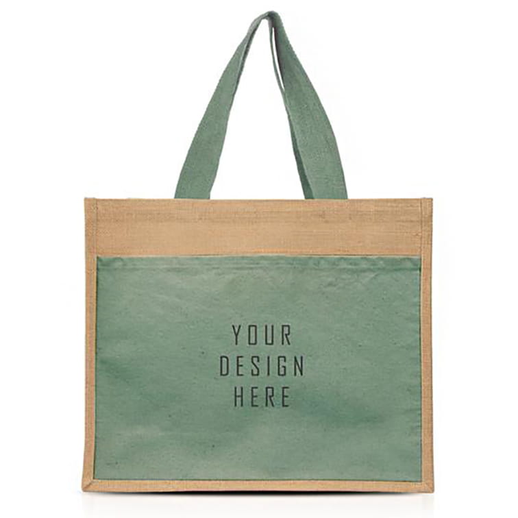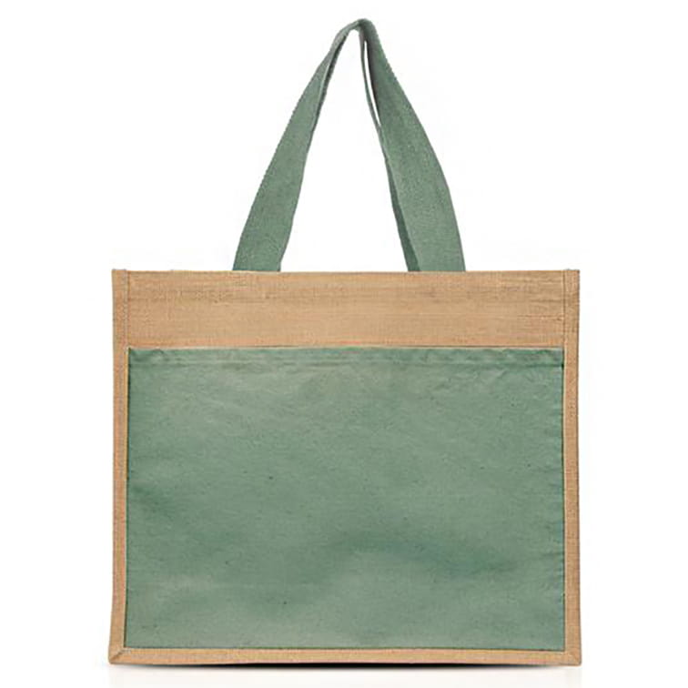 Laminowana jutowa torba z bawełnianą kieszonką, która zapewnia łatwy dostęp do najbardziej potrzebnych akcesoriów podczas zakupów lub wypadu na plażę. Wytrzymałość 11kg.