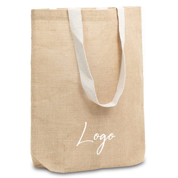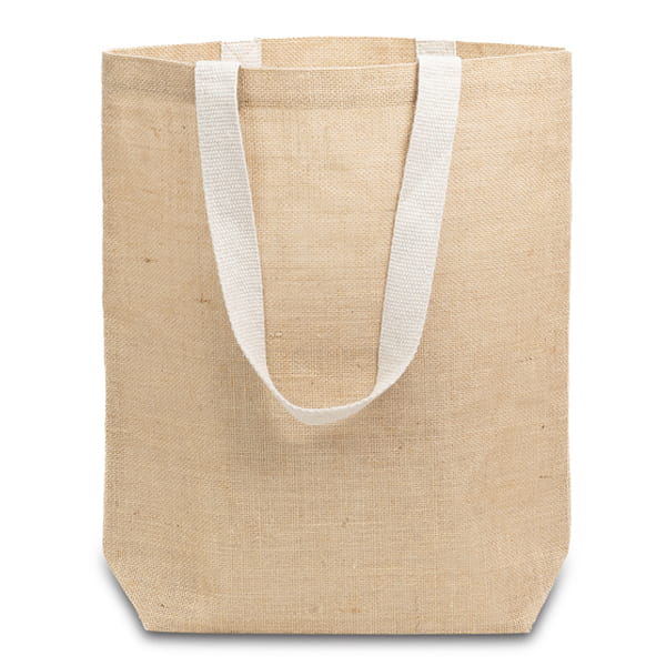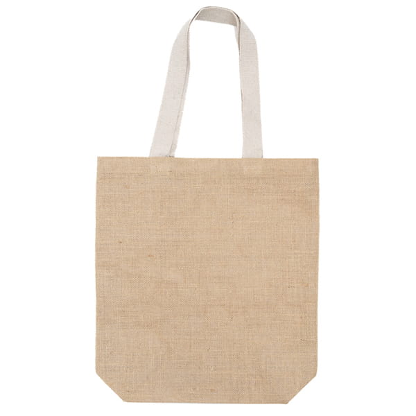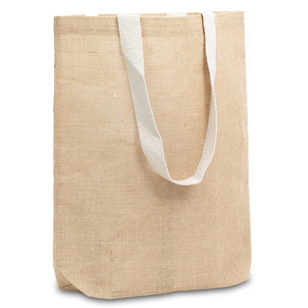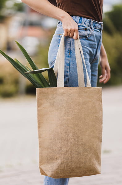 Ekologiczna torba na zakupy z juty, z dbałością o środowisko naturalne. Bawełniana rączka. Torba wewnątrz laminowana. Uprawy juty pochłaniają duże ilości dwutlenku węgla, nie wymagając przy tym nawadniania ani nawożenia. Produkt może być poddany procesowi recyklingu.