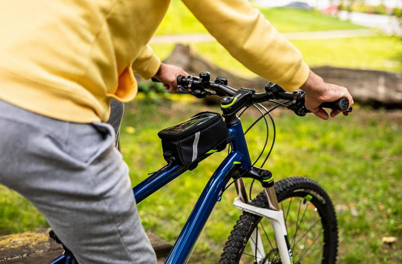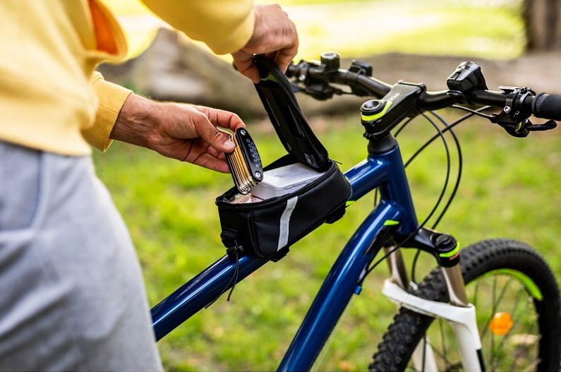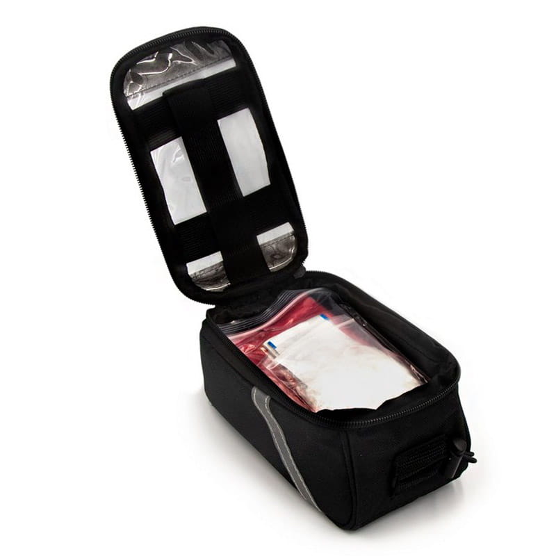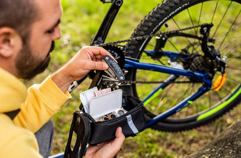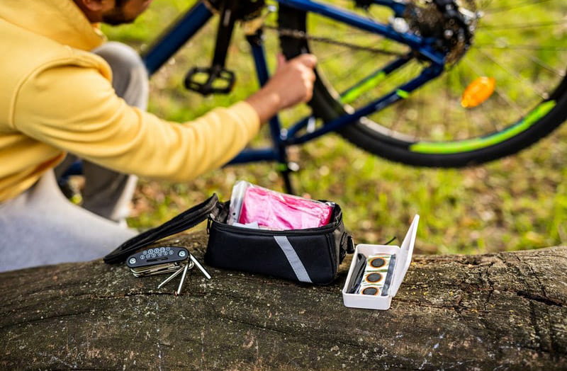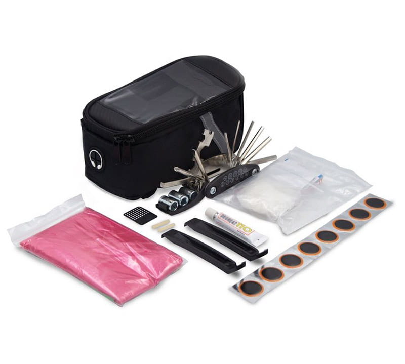 Torba rowerowa z wyposażeniem: okrągłe łatki rowerowe (8 szt.), klej, tarka, plastikowe łyżki do ściągania opony (2 szt.), jednorazowe ponczo, klucz wielofunkcyjny, zestaw pierwszej pomocy (8 plastrów 72 x 19 mm, 4 plastry 55 x 19 mm, 4 okrągłe plastry Ø20 mm, 6 chusteczek antyseptycznych, 1 chusteczka nasączona mydłem, 1 chusteczka do czyszczenia, rękawiczki winylowe)