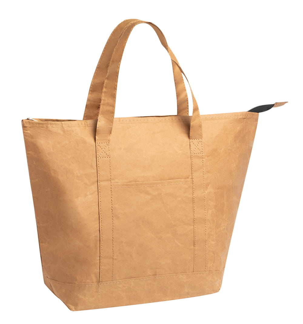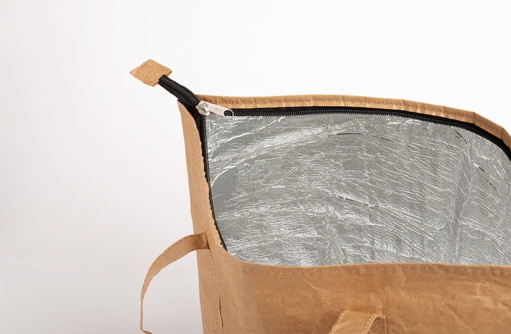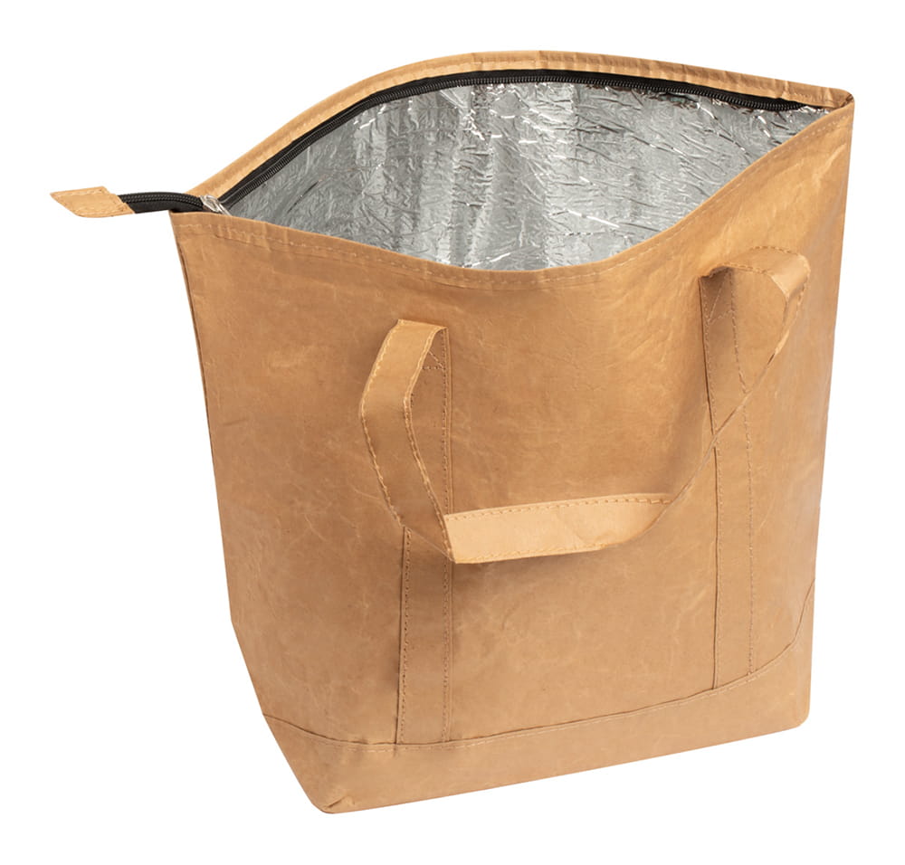 Zapinana, papierowa torba termiczna z aluminiowym wnętrzem i krótkimi uchwytami.