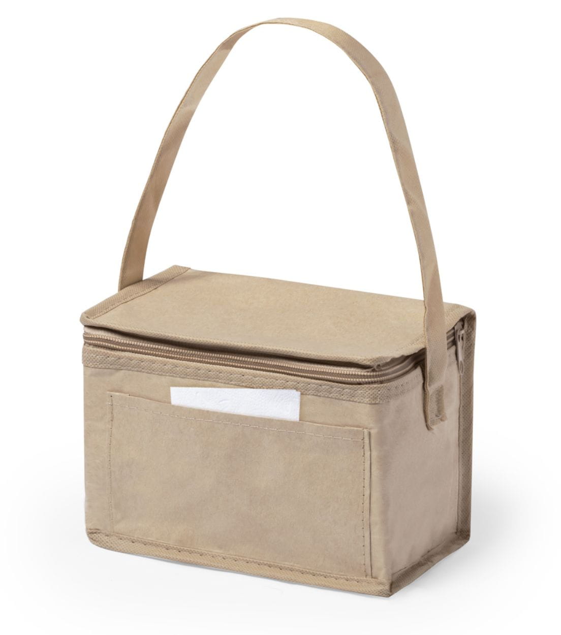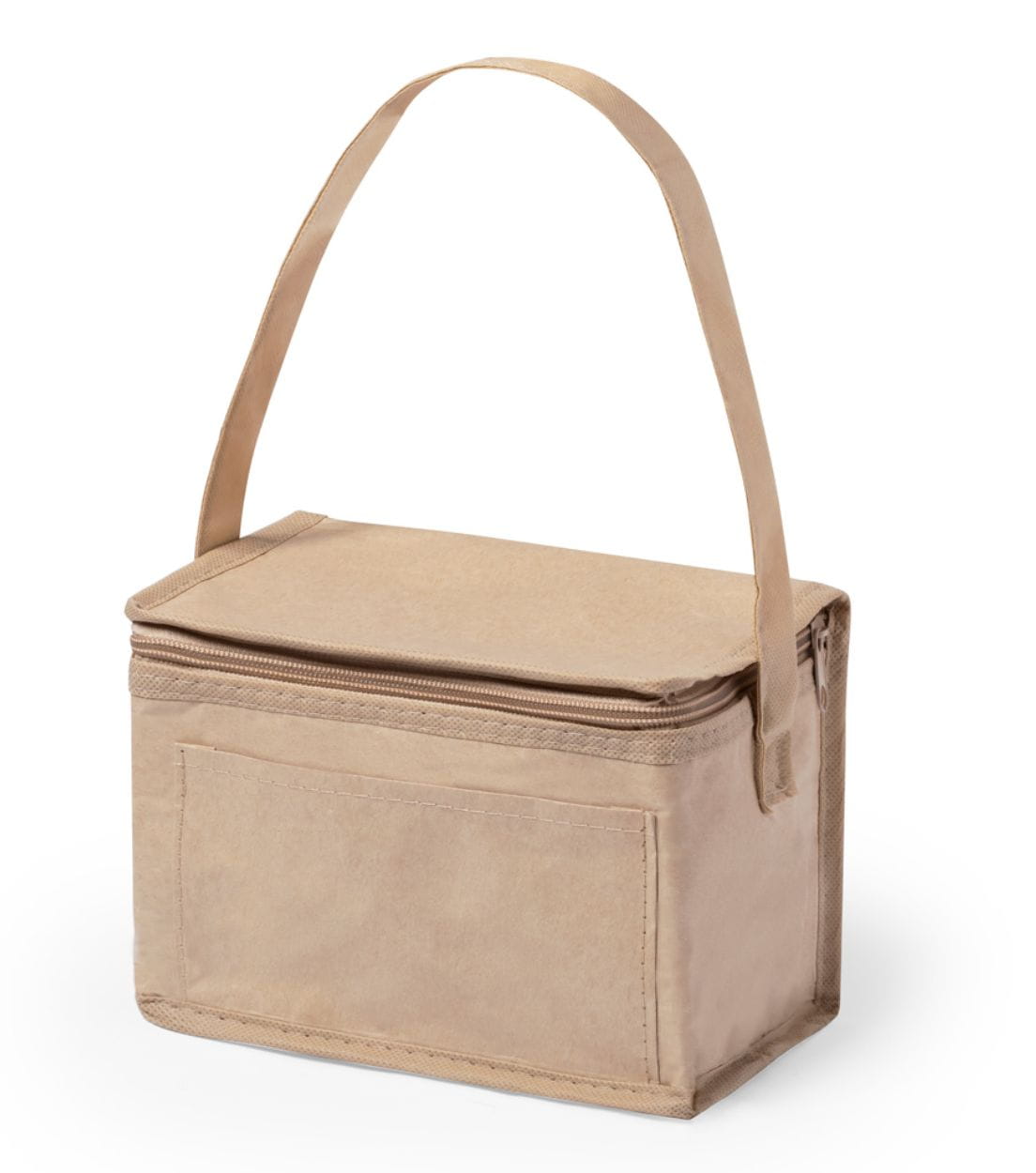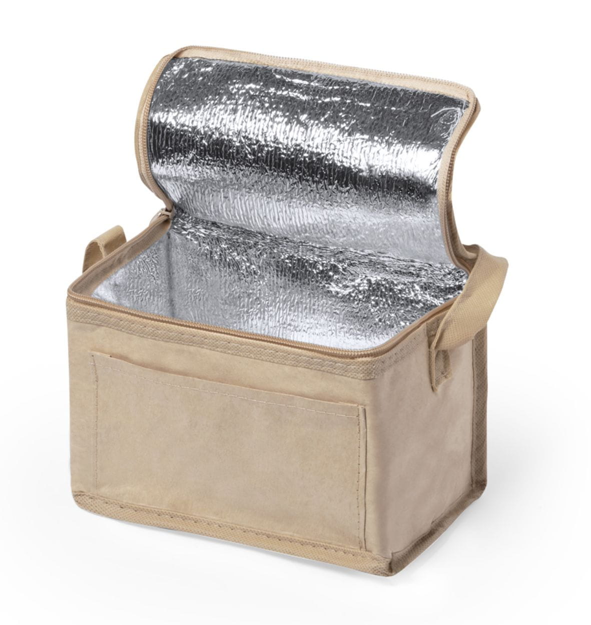 Zapinana na zamek torba termoizolacyjna z laminowanego papieru makulaturowego z aluminiową wypełnieniem, na 6 puszek 0,33 l. Z przednią kieszenią pod nadruk.