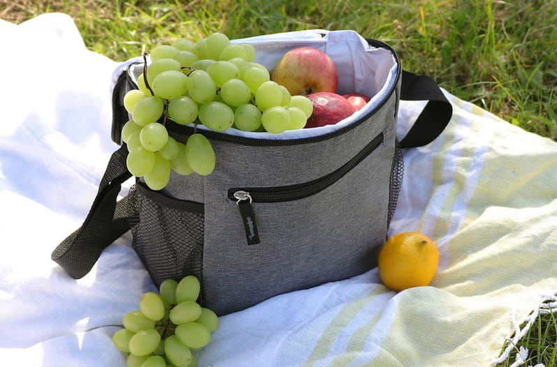 Torba termoizolacyjna, komora główna i przednia kieszeń zamykane na zamek błyskawiczny, 2 boczne kieszenie siateczkowe, rączka do noszenia oraz regulowany pasek na ramię