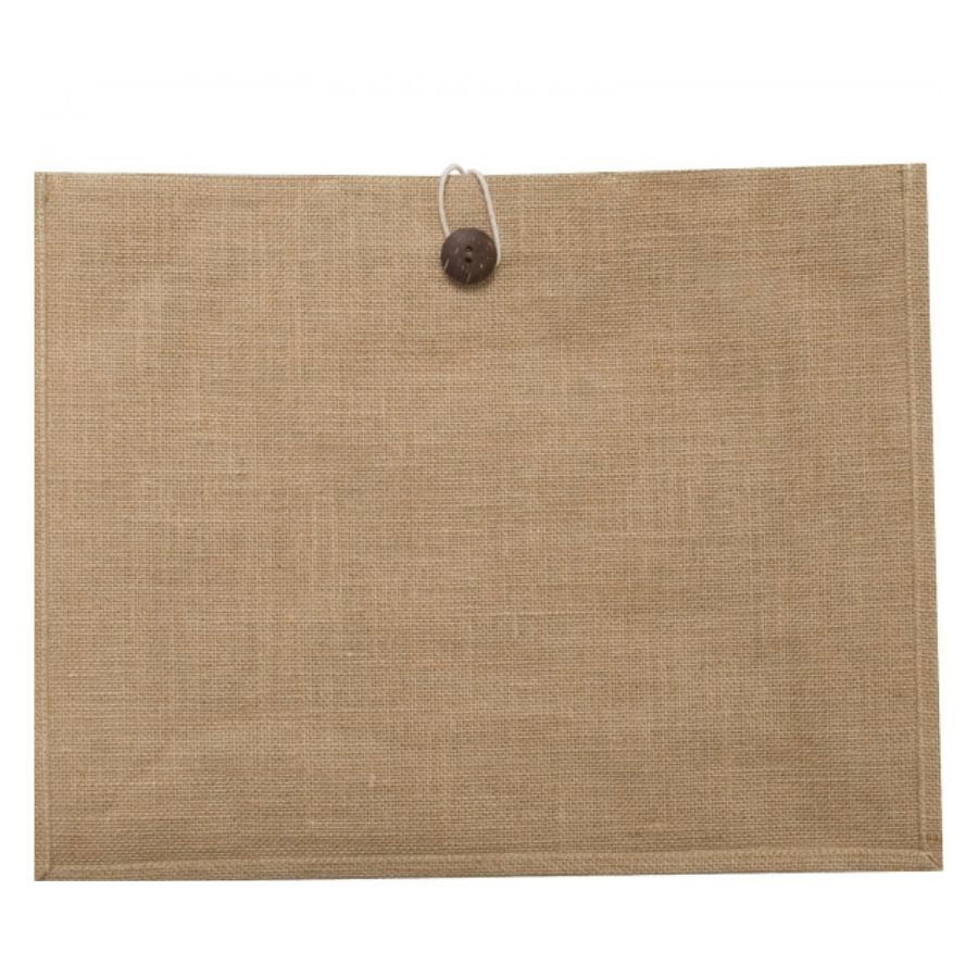 Ekologiczna torba z juty, w naturalnym kolorze, z uchwytami wykonanymi z mocnego sznurka, zamykana na guzik.