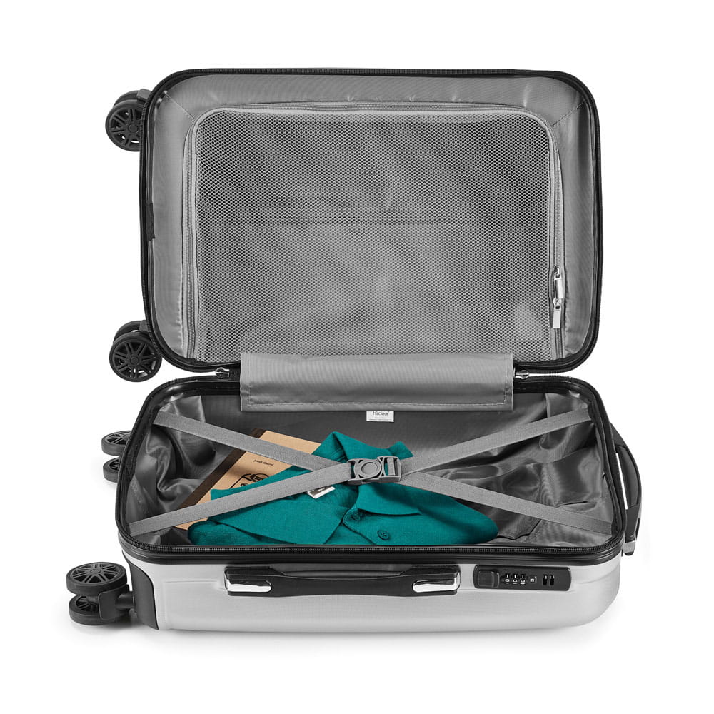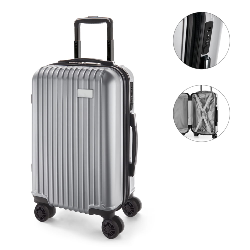 Walizka na kółkach. ABS i PET. Wyściełane wnętrze, z jedną przegrodą. 4 obrotowe podwójne kółka. Regulowany aluminiowy uchwyt z przyciskiem. Zamek szyfrowy. Z przodu wyjmowana metalowa płytka do personalizacji. Pojemność do 33 L. Waga: 2,70 kg. 335 x 540 x 225 mm | Metalowa płytka: 60 x 30 mm