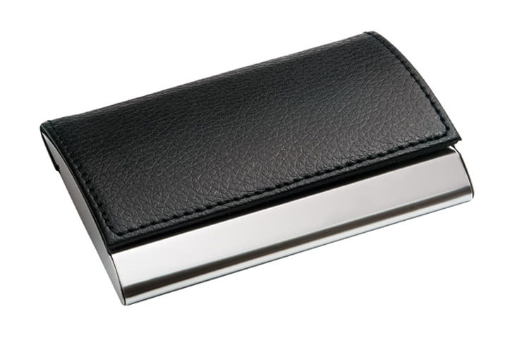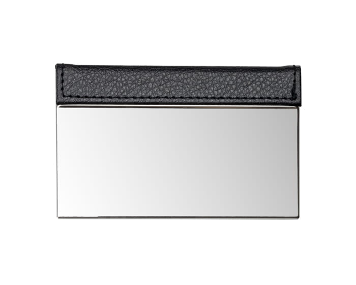 Wizytownik wykonany z metalu chromowanego, oprawiony w ekoskórę PU, zamykany na magnes. Pomieści on 10 standardowych wizytówek. Logo grawerujemy na metalowej powierzchni.