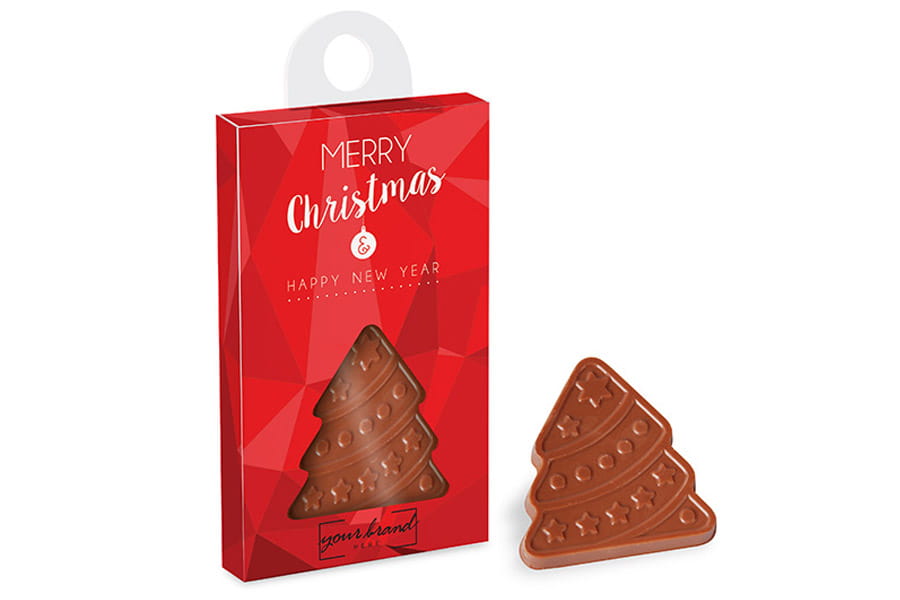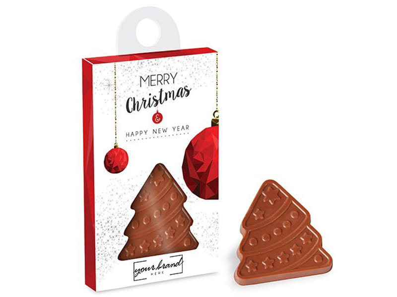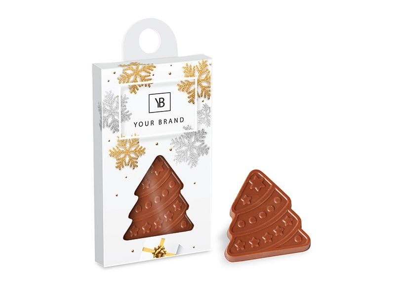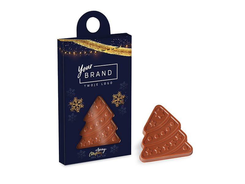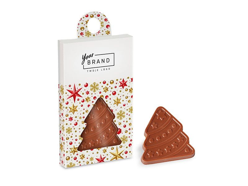 Pudełeczko z zawieszką zawierające choinkę z wyśmienitej mlecznej czekolady.