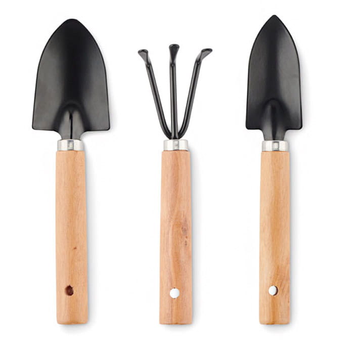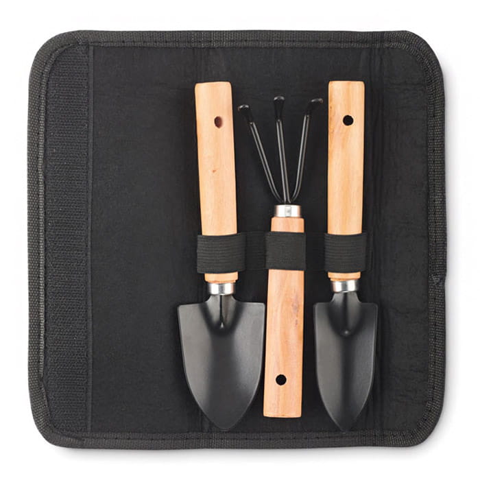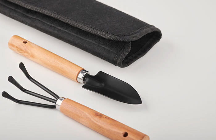 Zestaw 3 narzędzi ogrodowych. Grabki i 2 łopatki. Zapakowane w etui z filcu RPET.