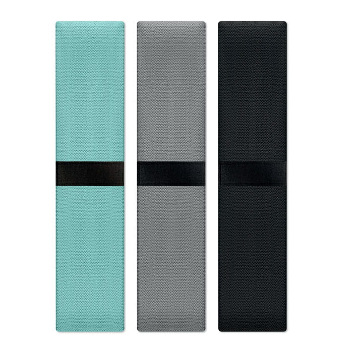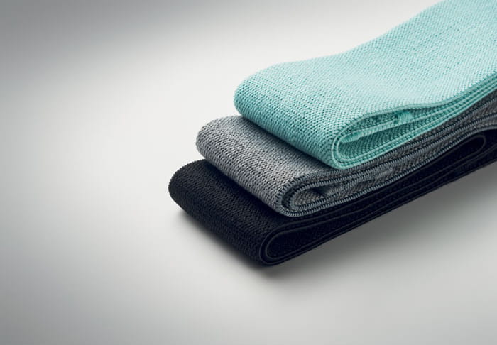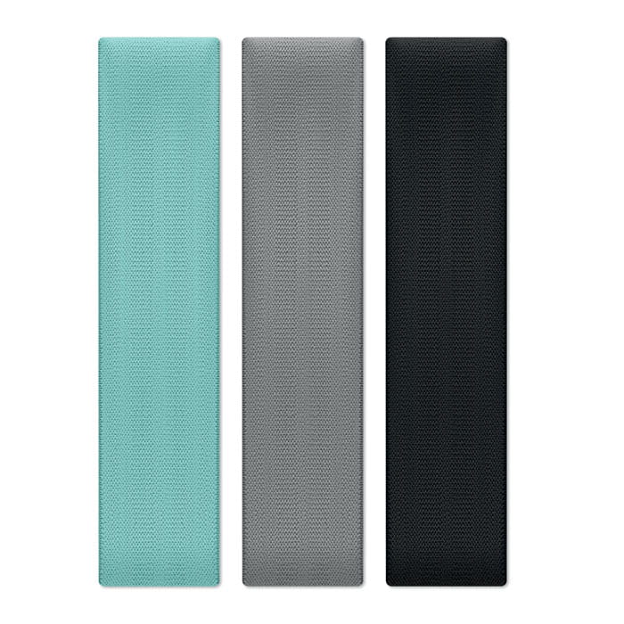 Zestaw 3 opasek fitness wykonanych z terylenu, bawełny i jedwabiu lateksowego w etui RPET. Trenuj swoje mięśnie i wzmocnij się używając tych opasek fitness podczas treningu. Każdy z nich ma inną siłę dla optymalnego treningu. Są one dostarczane w etui wykonanym z przetworzonego plastiku PET, dzięki czemu można je zabrać ze sobą na siłownię.