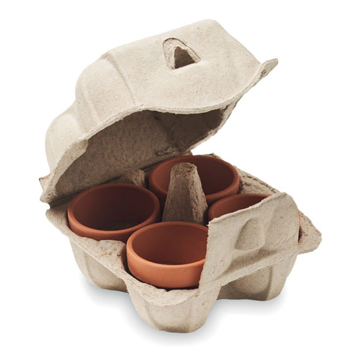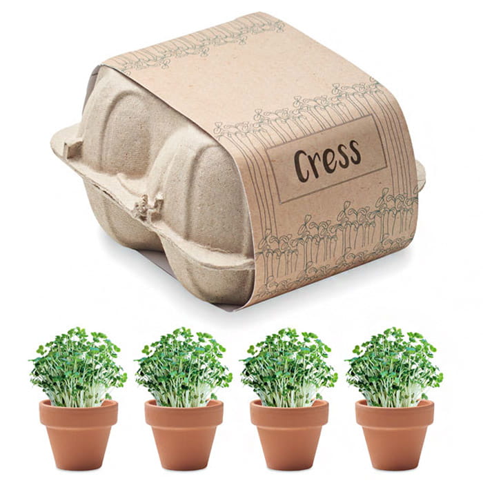 Zestaw 4 glinianych doniczek z terakoty, z nasionami rzeżuchy, w pudełku imitującym karton na jajka. Wyprodukowano w UE. Krążek torfowy w zestawie.