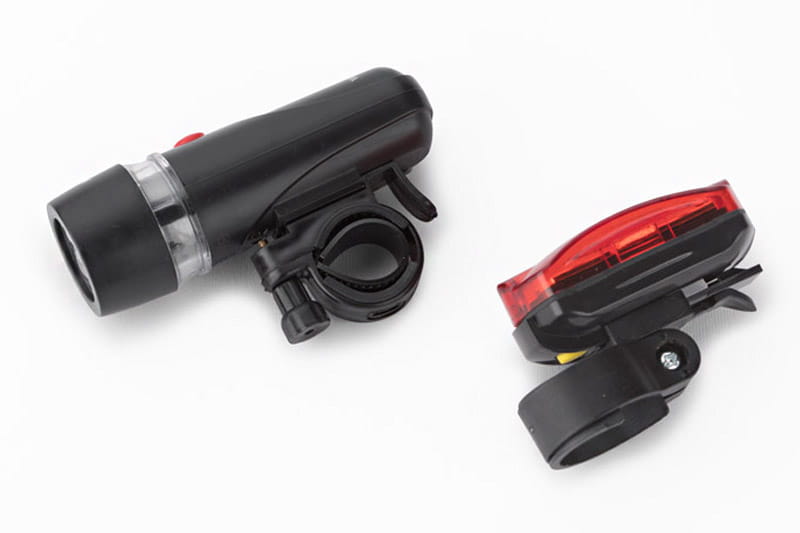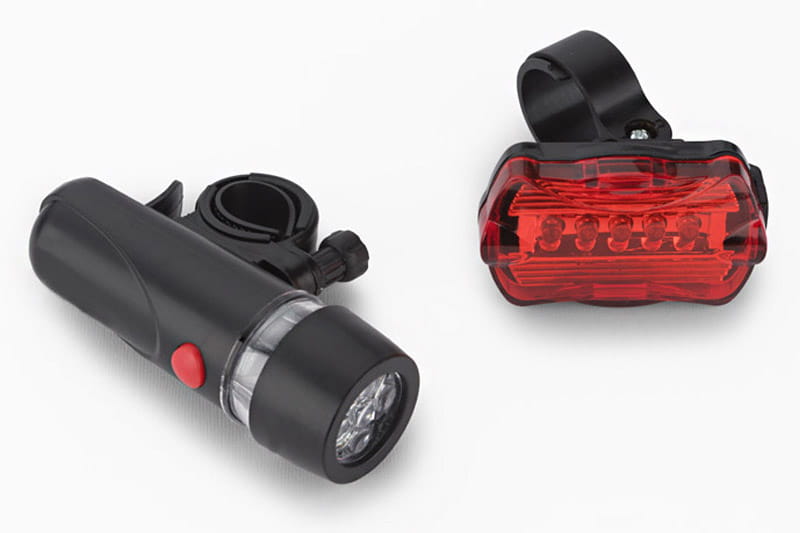 Zestaw lampek rowerowych o ekonomicznym źródle światła LED. Mocne światło przednie i zapewniające widoczność z kilkuset metrów światło tylne sprawią, że bez obaw będziesz jeździć o każdej porze dnia i nocy. Charakteryzują się bardzo łatwym montażem. Lampka przednia posiada 5 białych diod LED i 3 tryby świecenia: jeden ciągły i dwa migające. Natomiast lampka tylna posiada 5 czerwonych diod LED i 7 trybów świecenia: jeden ciągły i 6 migających.