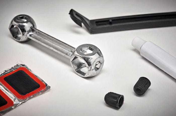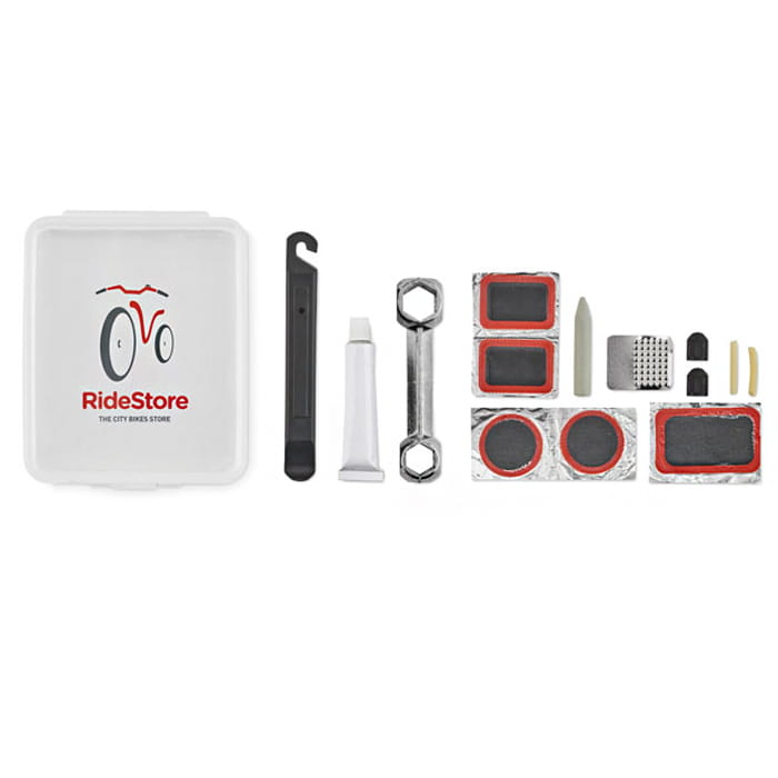 Zestaw naprawczy do roweru zawierający 1 klucz, 2 łyżki do opon, 1 klej, 2 zaślepki zaworów, 2 rurki zaworowe, 1 tarkę, 5 łatek naprawczych. Z tym zestawem będziesz mieć wszystko czego potrzebujesz, gdy zepsuje Ci się rower.