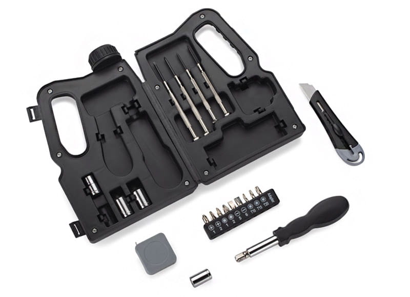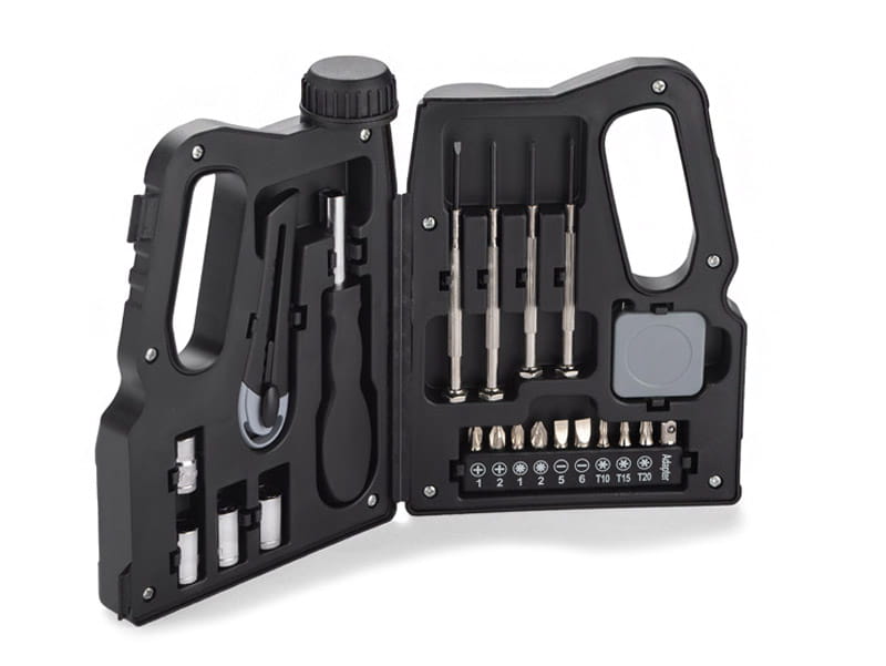 KANNIS to zestaw, w którym znajduje się wiele przydatnych narzędzi: cztery śrubokręty precyzyjne, nożyk do tapet, zwijana miara, uchwyt, cztery klucze nasadkowe z przejściówką i dziewięć bitów. Wszystko razem zamknięte jest w charakterystyczne etui w kształcie kanistra.