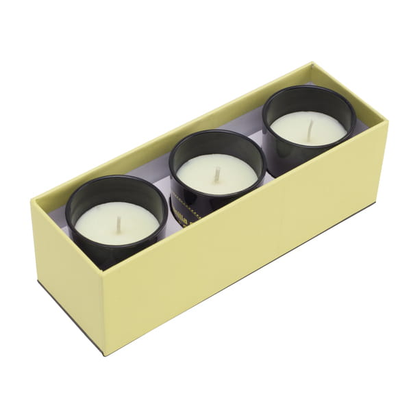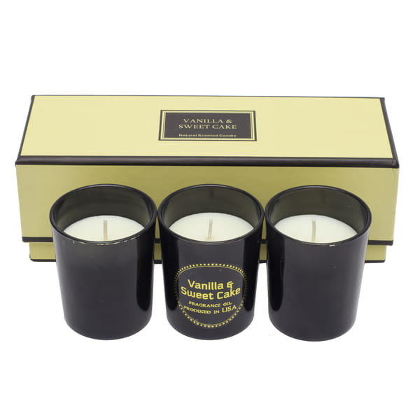 Zestaw 3 świec zapachowych w szklanych pojemnikach (56 x 67 x 56 mm). Zapach wanilii i ciasta. Pakowane w kartonowe opakowanie upominkowe.