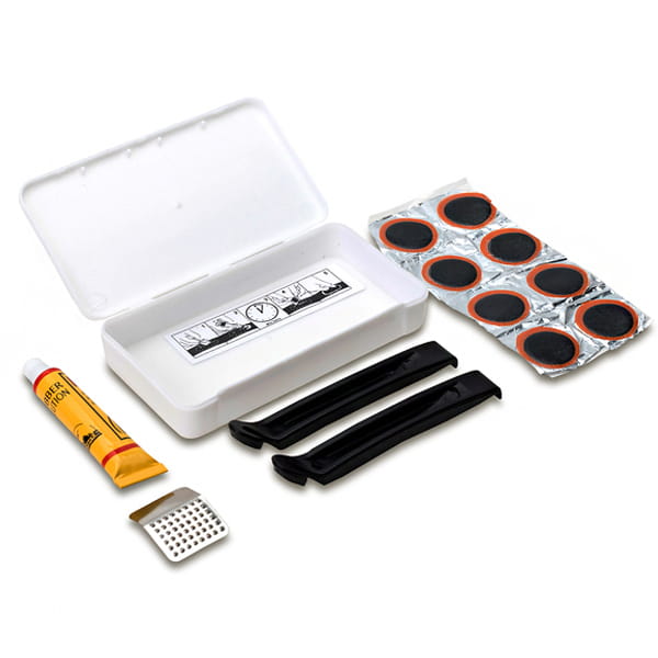 Zestaw do naprawy opon składający się z tarki, 8 łatek, kleju oraz 2 łyżek do opon. Całość w plastikowym pudełku.